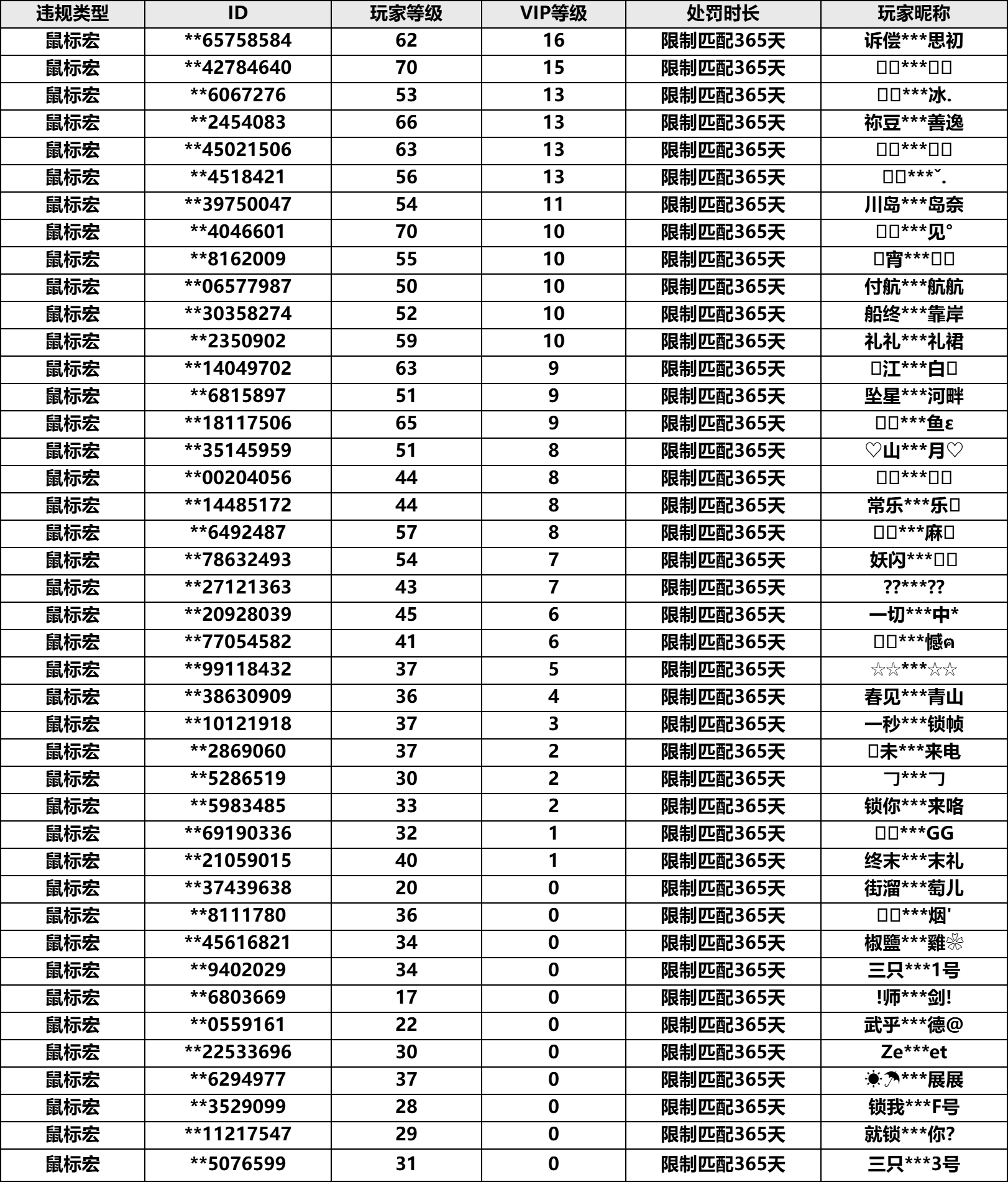 近日我们再次升级了鼠标宏检测方式,并进行定向打击,8月08日-8月21日,共处罚了161个违规账号。后续我们也将继续加大对鼠标宏的打击力度,还请各位荒友引以为戒,切勿使用鼠标宏影响游戏环境的公平性。同时,官方也将持续收集各位玩家对鼠标宏的举报案例,欢迎各位荒友通过游戏内外举报入口进行举报!以下是部分封禁名单。